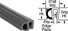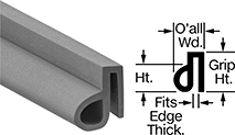 Fits Edge Thick. | Ht. | O'all Wd. | Grip Ht. | Grip Material | Core Material | Hardness | Hardness Rating | Bend Radius | Temp. Range, °F | For Use Outdoors | Specifications Met | Color | Lengths, ft. | 1-99 | 100-Up | |