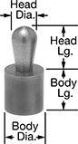 Dia. | Lg. | Dia. | Lg. | Max. Head Movement | Max. Spring Force, lbs. | Min. Body Dia. Tolerance | Max. Body Dia. Tolerance | Body Material | Each | Each | ||