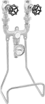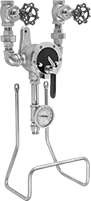 Commonly used in washdown applications, these systems include a temperature-regulating valve with an internal check valve and vacuum breaker to prevent backflow, two ball valves for manual control of the water supply, a dial thermometer that displays the outlet temperature, and a hose rack for storage.