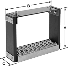 Wd. | Dp. | Ht. | Thick. | Bearing Bar Ht. | Wd. | Lg. | Load Capacity, lbs. | No. of | Dia. | Lg. | Wd. | Ctr.-to-Ctr. (A) | Ctr.-to-Tread Top (B) | Ctr.-to-Tread Nosing (C) | Mounting Hardware Included | For Use Outdoors | Each | |