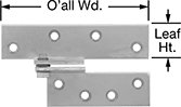 | For Hinge O'all Wd. | Max. Offset | For Max. Door Thick. | Ht. | Wd. | Ht. | Wd. | O'all Wd. | Leaf Thick. | Range of Motion | Pin Material | Mounting Fasteners Included | Each | |