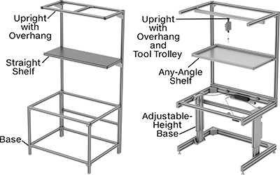 Uprights with overhang fit bases to expand your workstation. You can mount lighting, tools, shelves, and other accessories onto them.