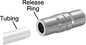 Insert tubing into these fittings and an internal gripping ring and O-ring hold the tubing tight. They are also known as instant fittings. To disconnect, push on the release ring and pull the tubing out of the fitting. Fittings have good corrosion resistance. Use them in low-pressure applications.