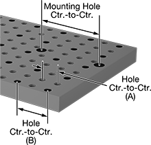 Lg. | Wd. | Thick. | No. of | Thread Size | Ctr.-to-Ctr. (A) | No. of | Dia. | Ctr.-to-Ctr. (B) | No. of | Style | Ctr.-to-Ctr. | For Mounting Screw Size | Wt., lbs. | Parallel Tolerance | Material | Each | |