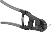 A double hinge provides high cutting force with low gripping pressure. These cutters are also known as aviation snips. A spring opens the jaws for quick cutting, and a locking latch holds them together when the cutter is not in use. Blades are serrated to prevent slipping.