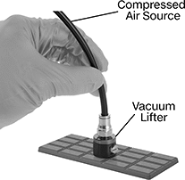 This lifter uses a quiet continuous-vacuum system and fingertip control to pick up and release small, delicate parts. Press the button on the probe to release suction. Use on smooth, nonporous surfaces, such as mirrors and metal sheets.