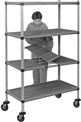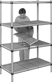 Often used in food service areas and laboratories, these shelving units have removable, dishwasher-safe panels that are treated to prevent degradation caused by the growth of stain- and odor-causing bacteria. The included split sleeves wedge underneath shelves and snap onto posts. Push the quick-adjust lever down to lock shelves into place.