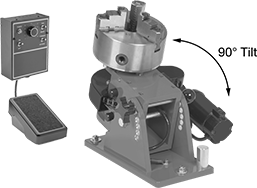 Mount a workpiece on these motorized turntables for smooth and continuous 360° rotary motion useful for creating circular welds. Turntables tilt and lock in place at angles up to 90° in 15° increments. Once the workpiece is attached to the turntable or chuck, press the foot pedal to start the motor. As the part rotates, your hands are free to focus on the weld.