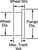 Dia. | Wd. | Mount Ht. | Cap. per Caster, lbs. | Flange Dia. | For Max. Track Wd. | Type | Material | Frame Material | Each | |